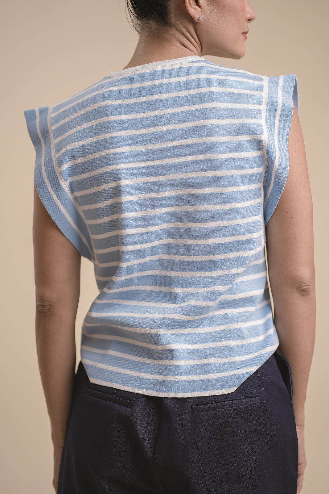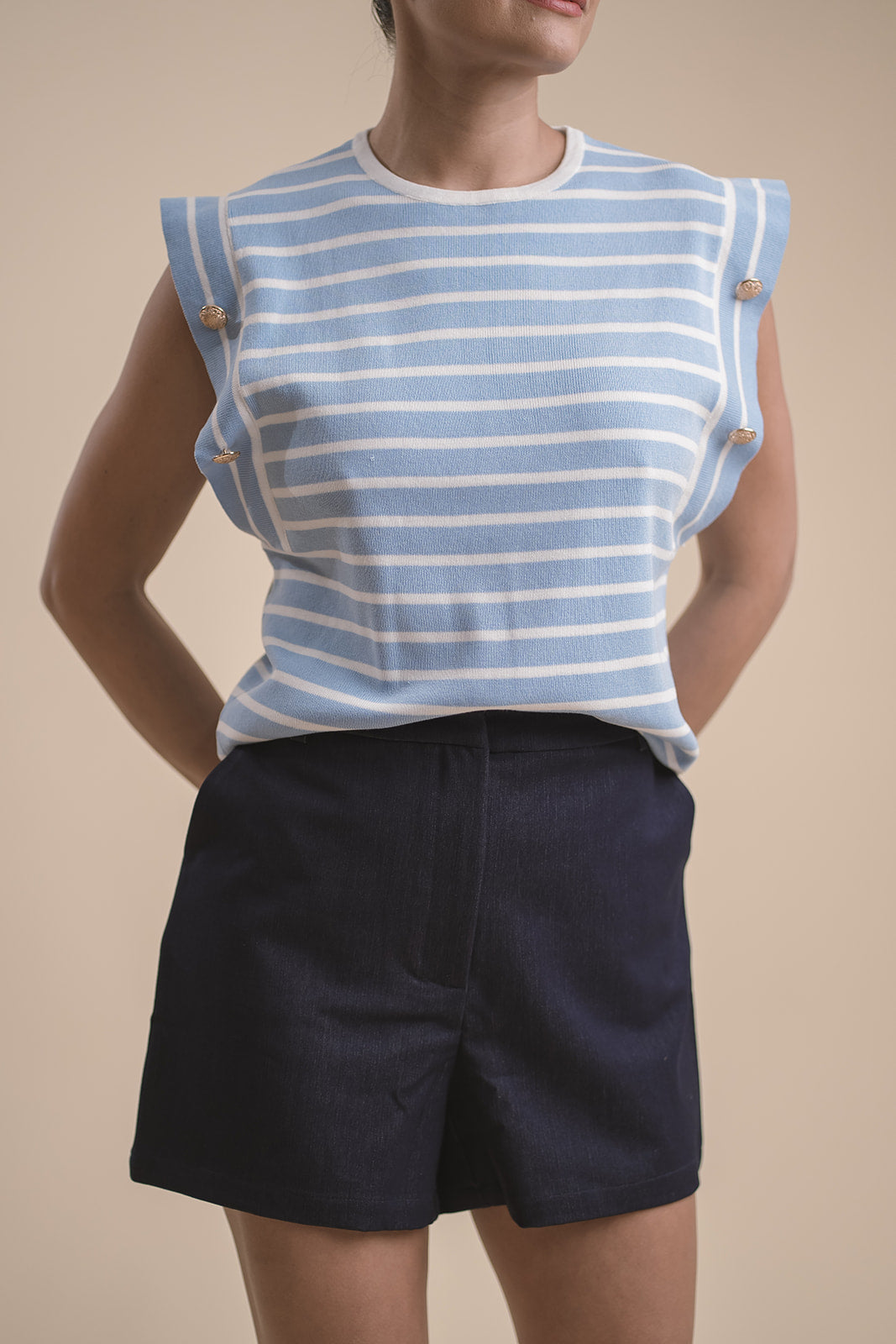 Chaleco cuello redondo, tejido elasticado, detalle en los hombros con apliques dorados.