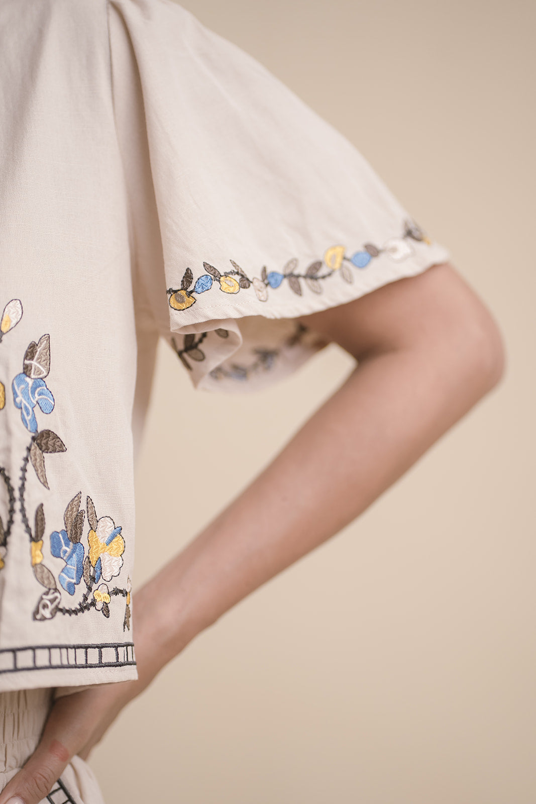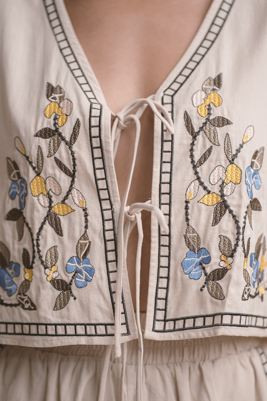 Blusa de lino, con detalles de bordados en aplicación y en costura, con dos tiras delanteras.