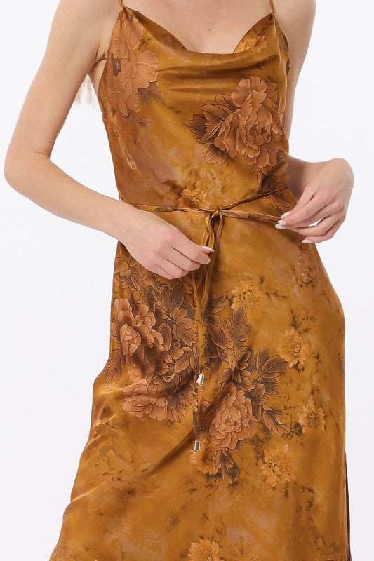 Vestido largo con cuello drapeado, espalda con tirantes y cinturón.