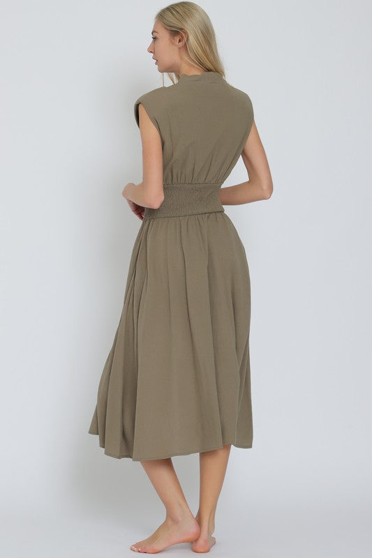 Vestido midi con hombros, cintura fruncida y cremallera delantera